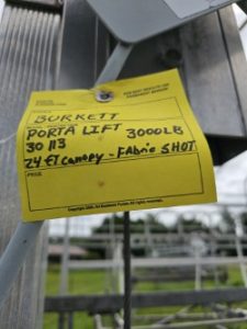 3000# PORTA LIFT 30113 WITH 24' CANOPY. HAS GREEN CANOPY FABRIC THAT WILL NEED TO BE REPLACED. SOLD AS IS IN GOOD WORKING ORDER. LOCAL DELIVERY AND INSTALL AVAILABLE FOR A CHARGE. PLEASE CALL OR EMAIL WITH ANY QUESTIONS.